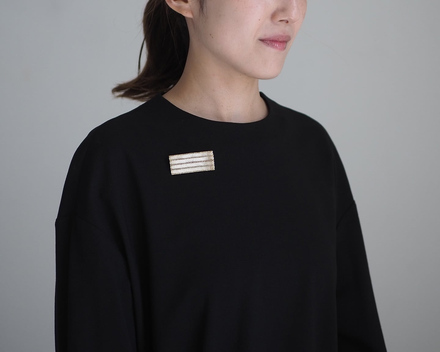 胸元につけると名札ぽくなるので、首元(鎖骨のあたり)に着けてみて下さい。目線が上がってバランスが良くなるので、お顔まわりが華やかな印象になります。