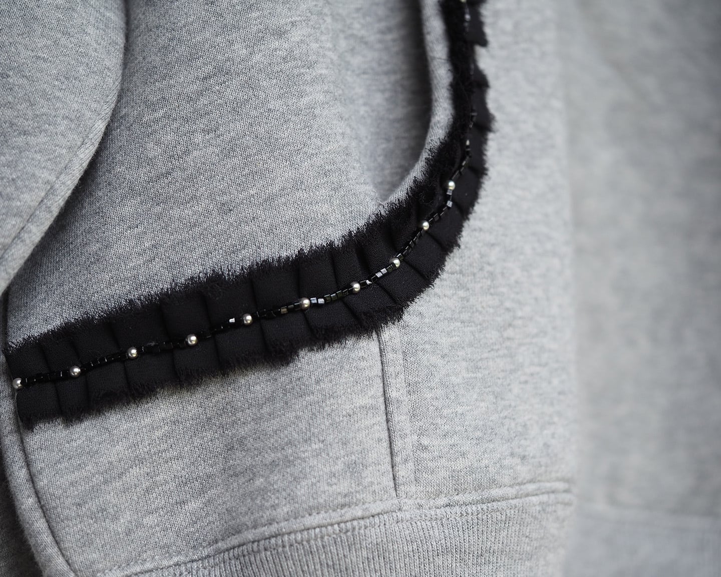 カジュアルなスエット素材に、上品な雰囲気のジョーゼットやパール、スクエア形のビーズなど異素材を刺繍して、ちょっときれいめにデコレーションしてみます。みんなで一緒に楽しく作りましょう!