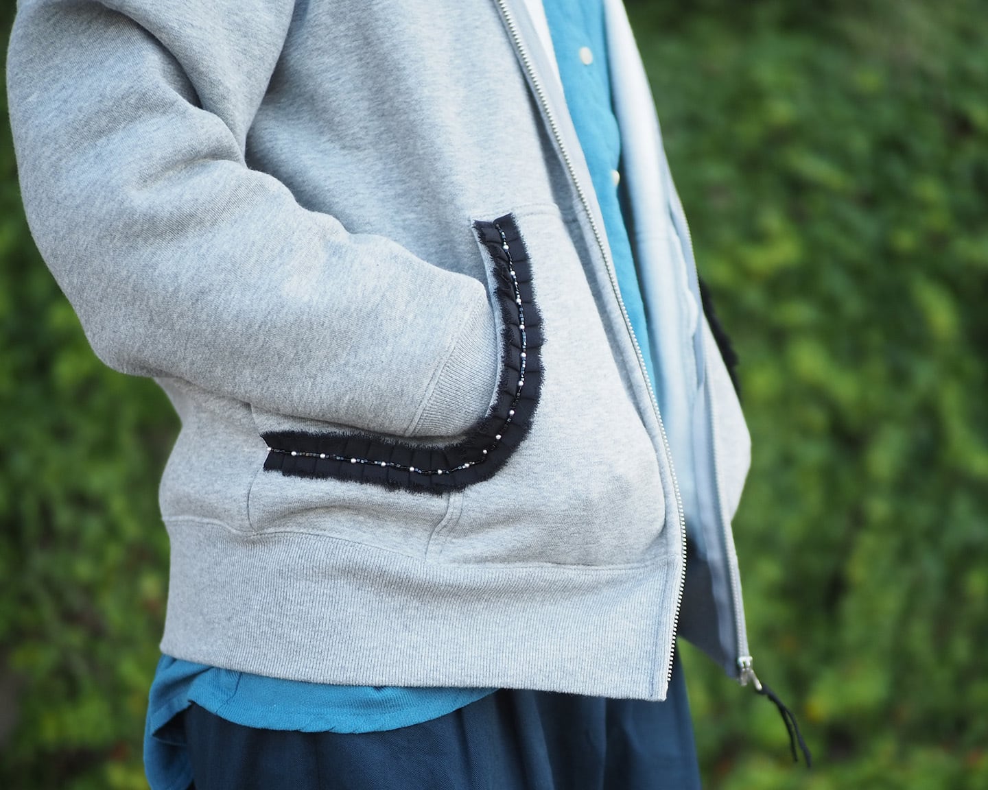 カジュアルなスウェット素材に、上品な雰囲気のジョーゼットやパール、スクエア形のビーズなど異素材を刺繍して、ちょっときれいめにデコレーションしてみます。みんなで一緒に楽しく作りましょう!