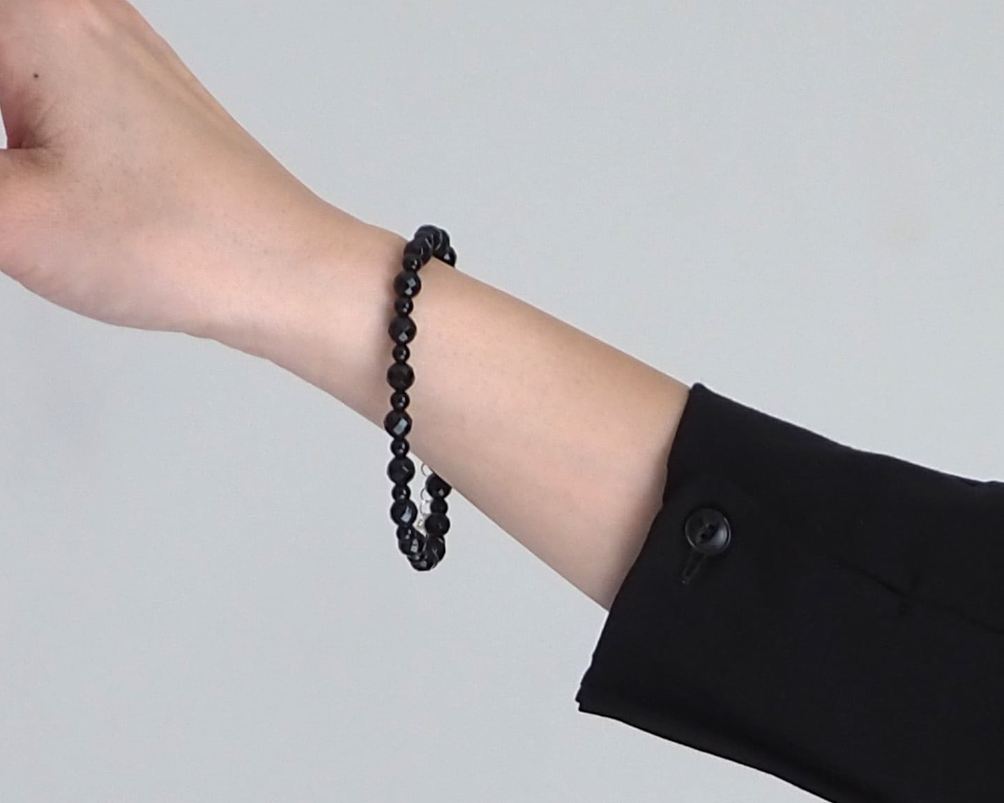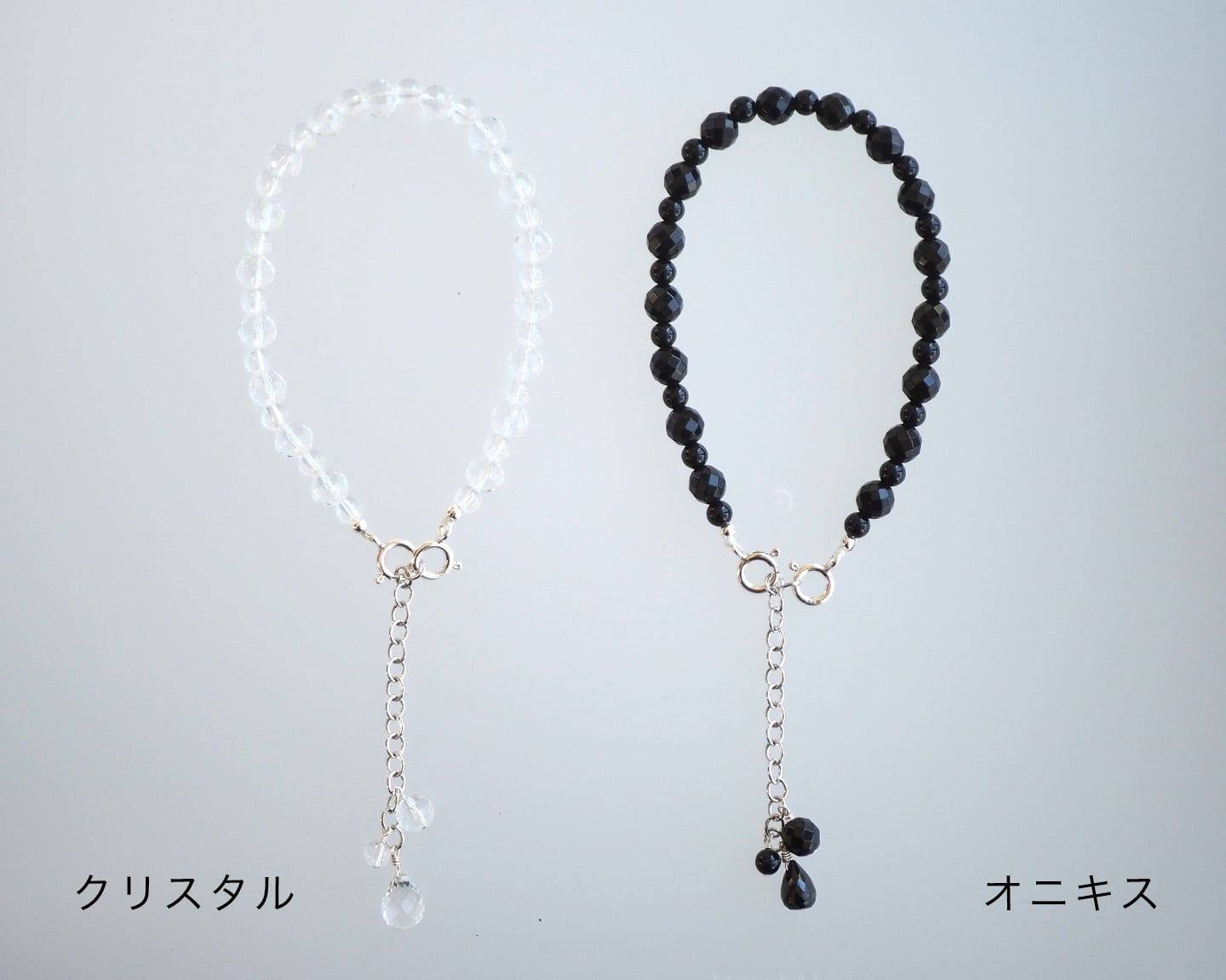 ブレスレットの天然石は、かっこいいブラックオニキスと、透明感のあるクリスタル。雰囲気が全く違うので、お好みでどうぞ。