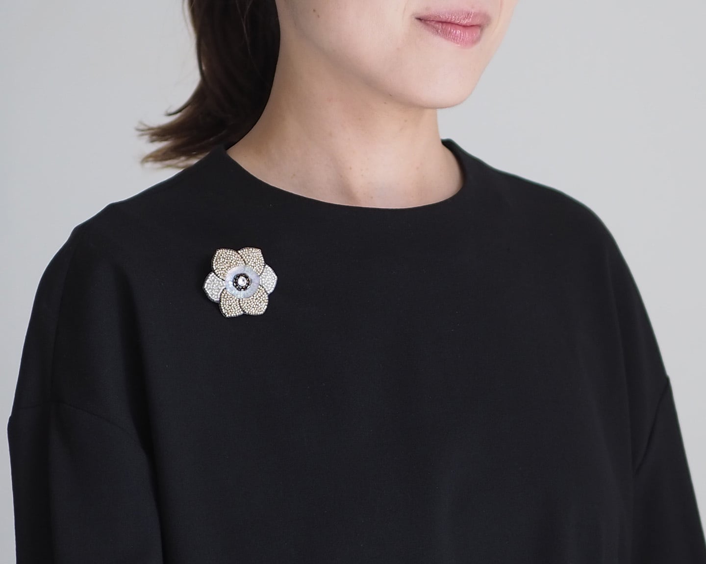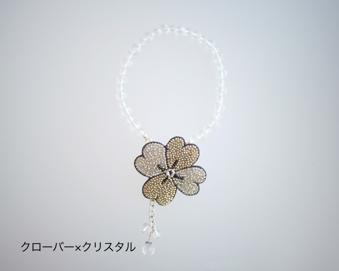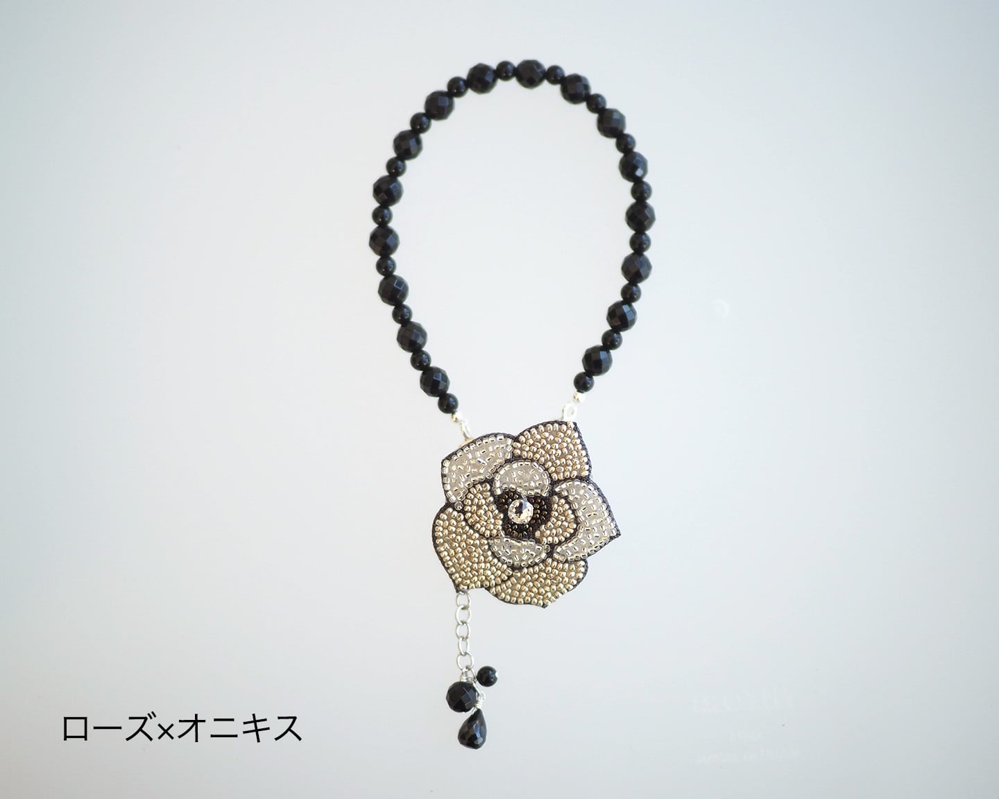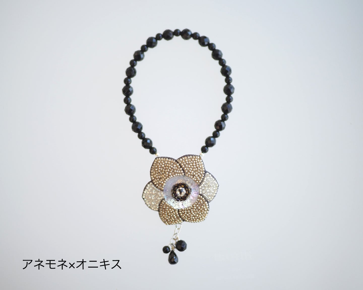 素 材:グラスビーズ(チェコ、日本)/スパンコール(フランス)/天然石(ブラックオニキス/クリスタル)/樹脂/SV925(ブレスレット金具)/真鍮(ブローチ金具)