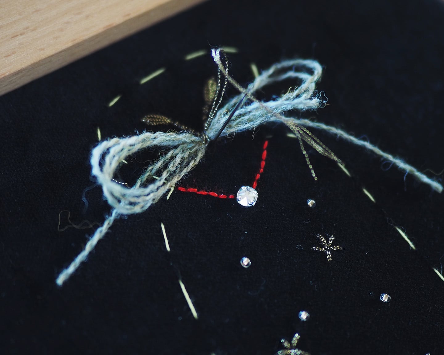 顔やからだの刺繍をしてから、手縫いで形を作っていきます。クリスマスも近いので、ツリーに飾っても合うように模様を作りました。ひと針ひと針自分の手で縫ったネコちゃんはかわいさもひとしおですよ。