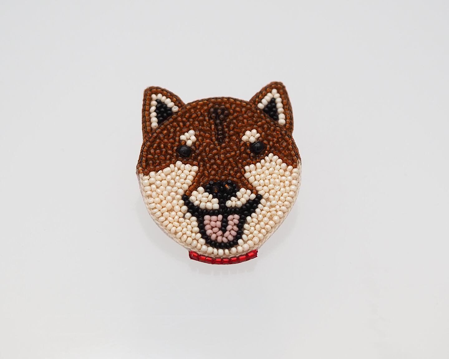 柴犬は、毛色のかなり細かいところまでビーズで再現しています。粒が小さなビーズだからこそできる繊細な表現です。ブラックオニキスのつぶらな瞳、ピンクの舌がポイント。
