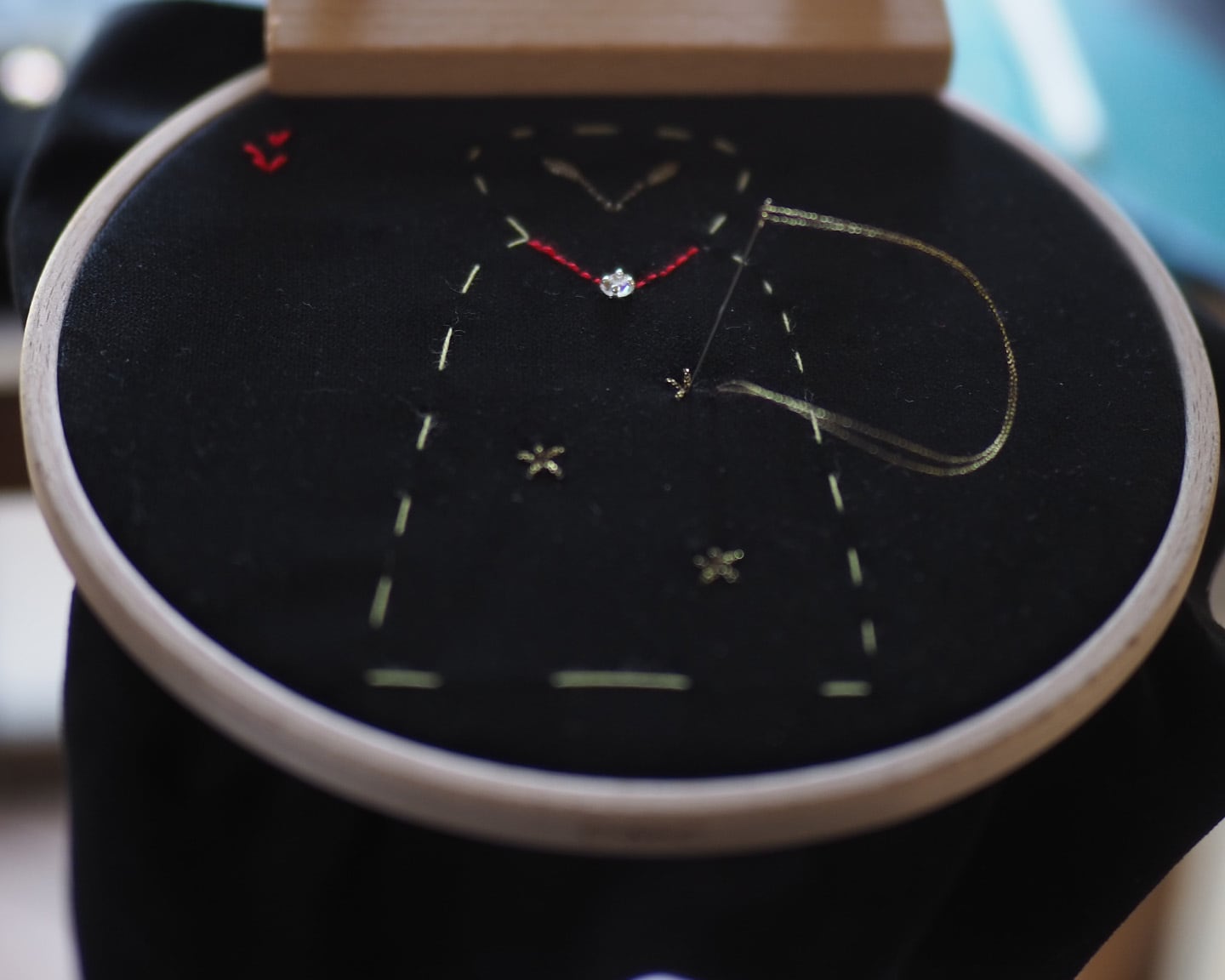 顔やからだの刺繍をしてから、手縫いで形を作っていきます。クリスマスも近いので、ツリーに飾っても合うように模様を作りました。ひと針ひと針自分の手で縫ったネコちゃんはかわいさもひとしおですよ。